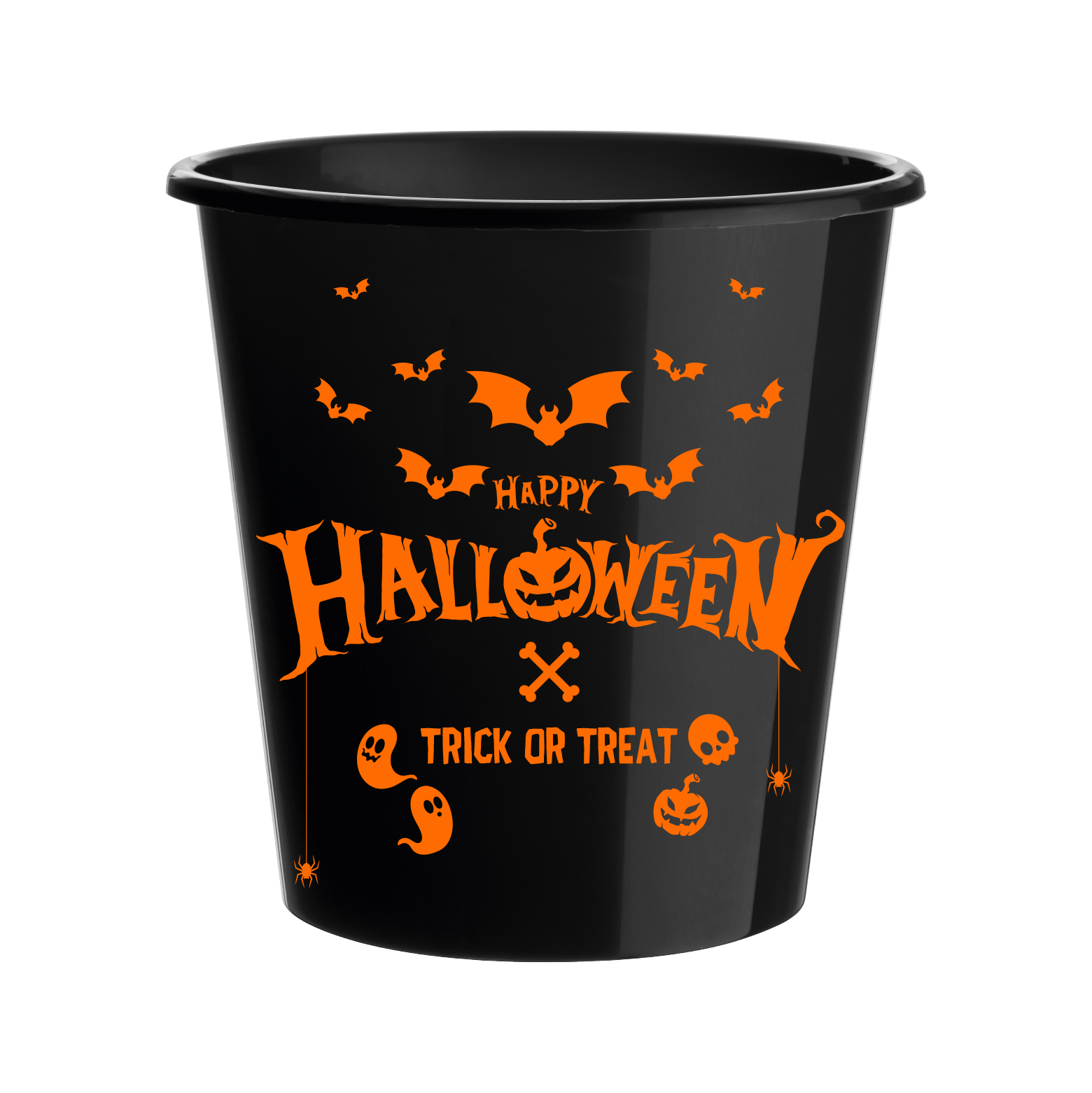 Entre no clima do Halloween com esse balde decorativo temático, perfeito para festas, decoração ou distribuição de doces! Com estampa laranja vibrante sobre fundo preto, ele traz morcegos, fantasmas, abóboras e caveiras em um visual divertido e assustador.