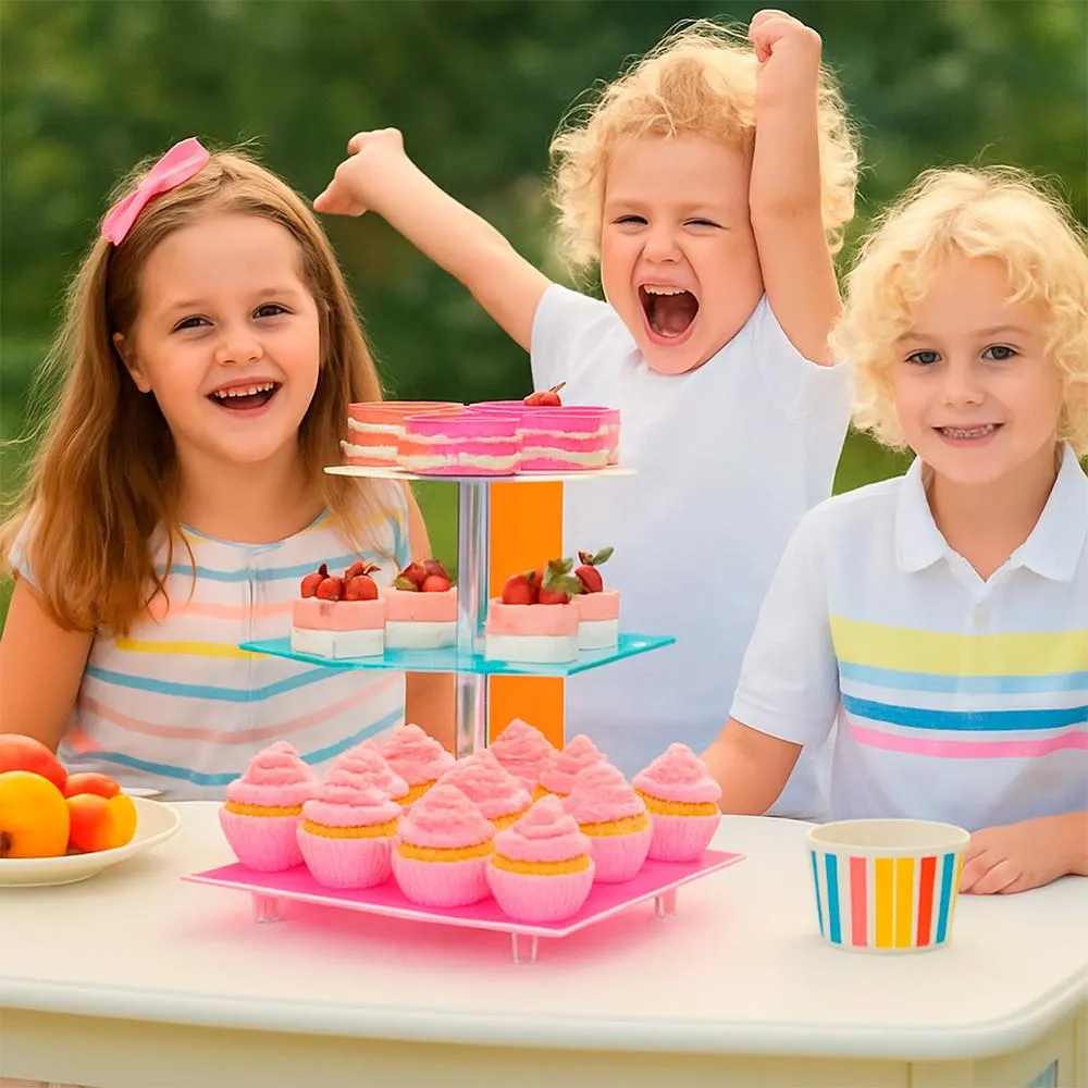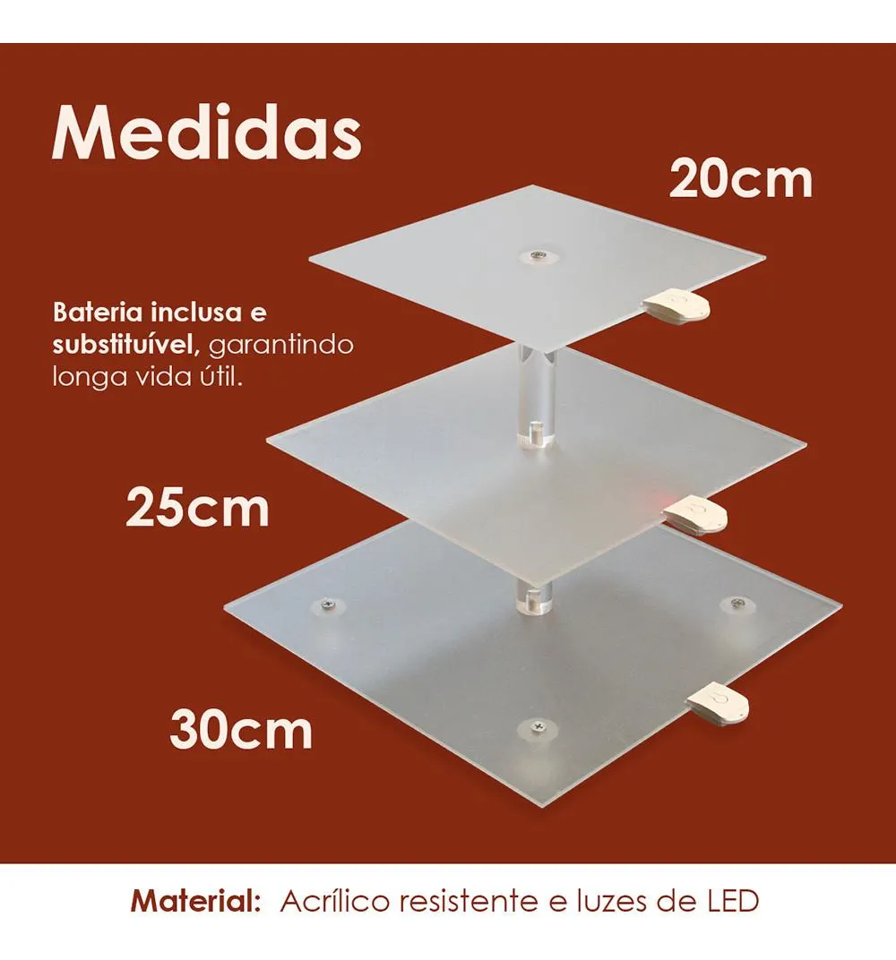 Boleira em acrílico com montagem simples, composta por 3 andares — base de 30 cm, meio de 25 cm e topo de 20 cm — ideal para festas e eventos noturnos graças à iluminação em LED. Possui luzes em 7 cores diferentes, com opção de iluminação fixa ou em movimento, criando efeito divertido e descolado que valoriza a decoração da mesa.