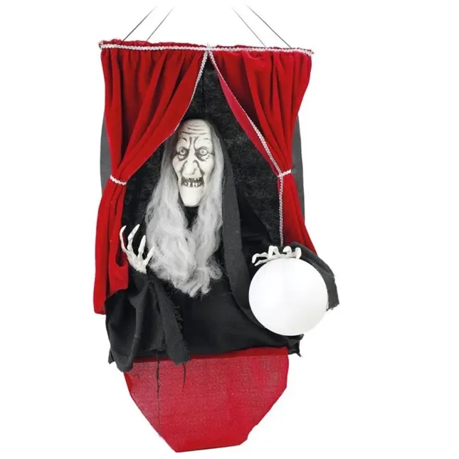 Transforme sua decoração de Halloween com esta peça incrível e cheia de personalidade! A Bruxa Cigana na Tenda é um boneco decorativo animado que une som, movimento e riqueza de detalhes, ideal para criar um ambiente mágico e misterioso.