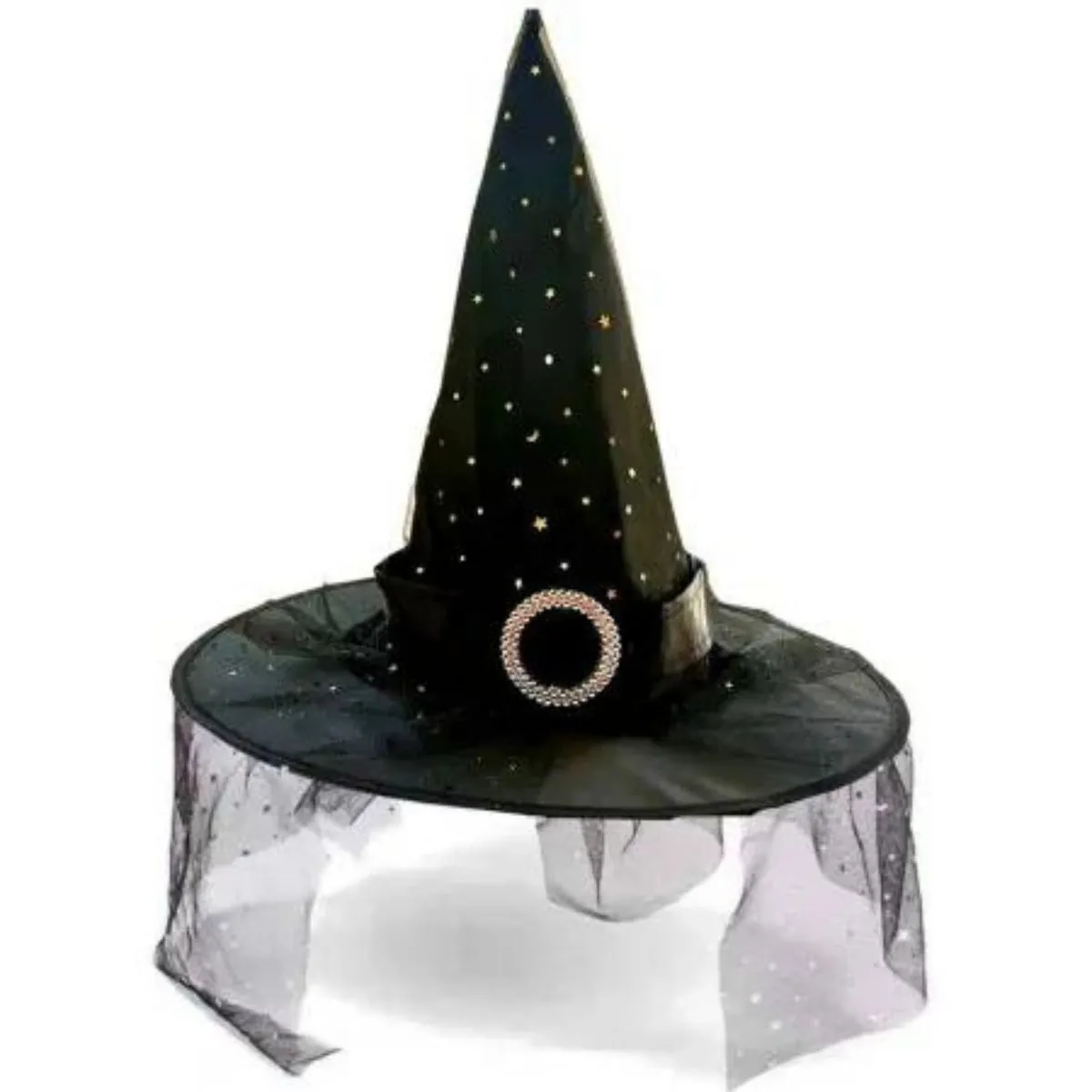 CHAPÉU DE BRUXA COM ESTRELAS FIVELA E TULE 37 CM PRETO