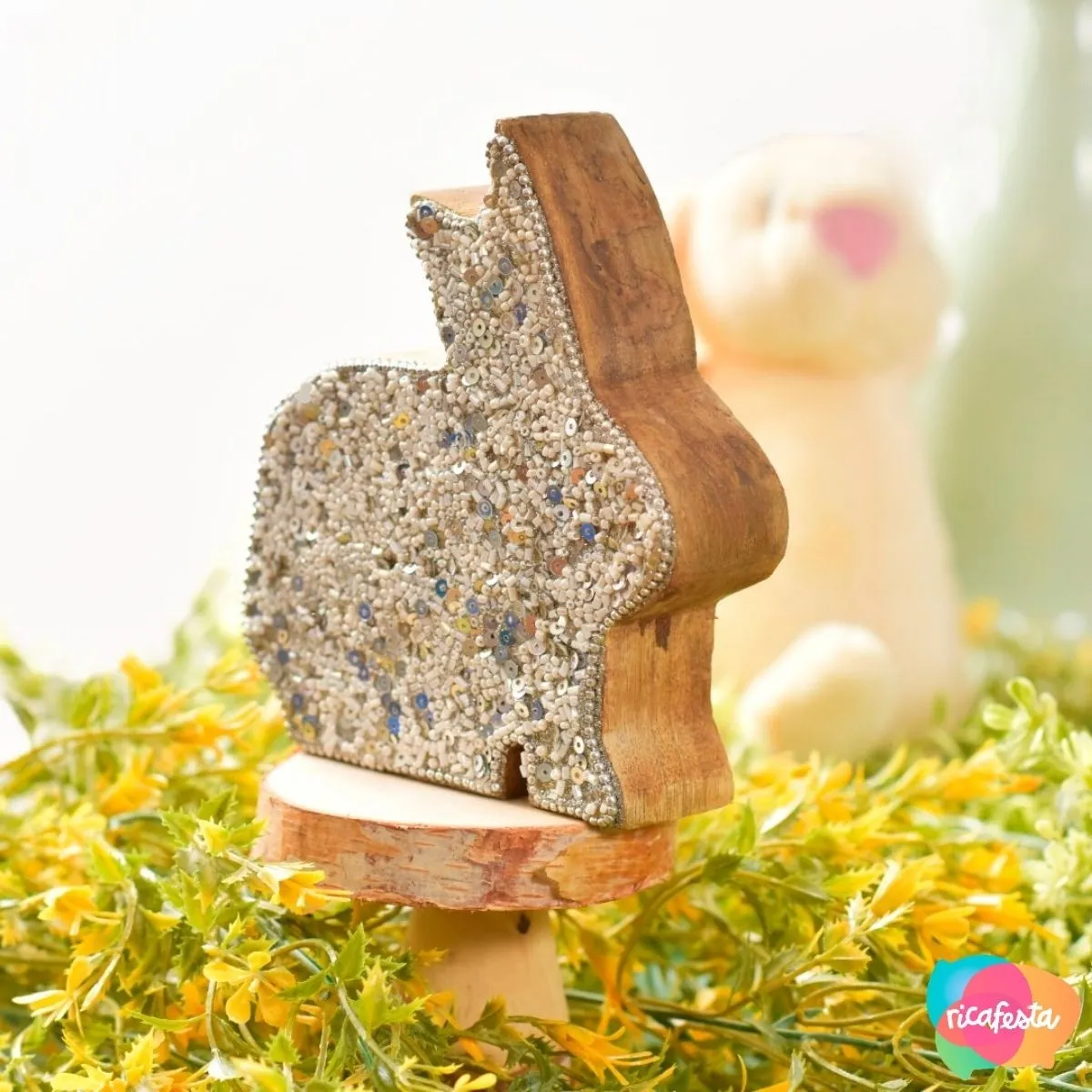 COELHO COM MADEIRA E LANTEJOULAS 12,5X15X4CM