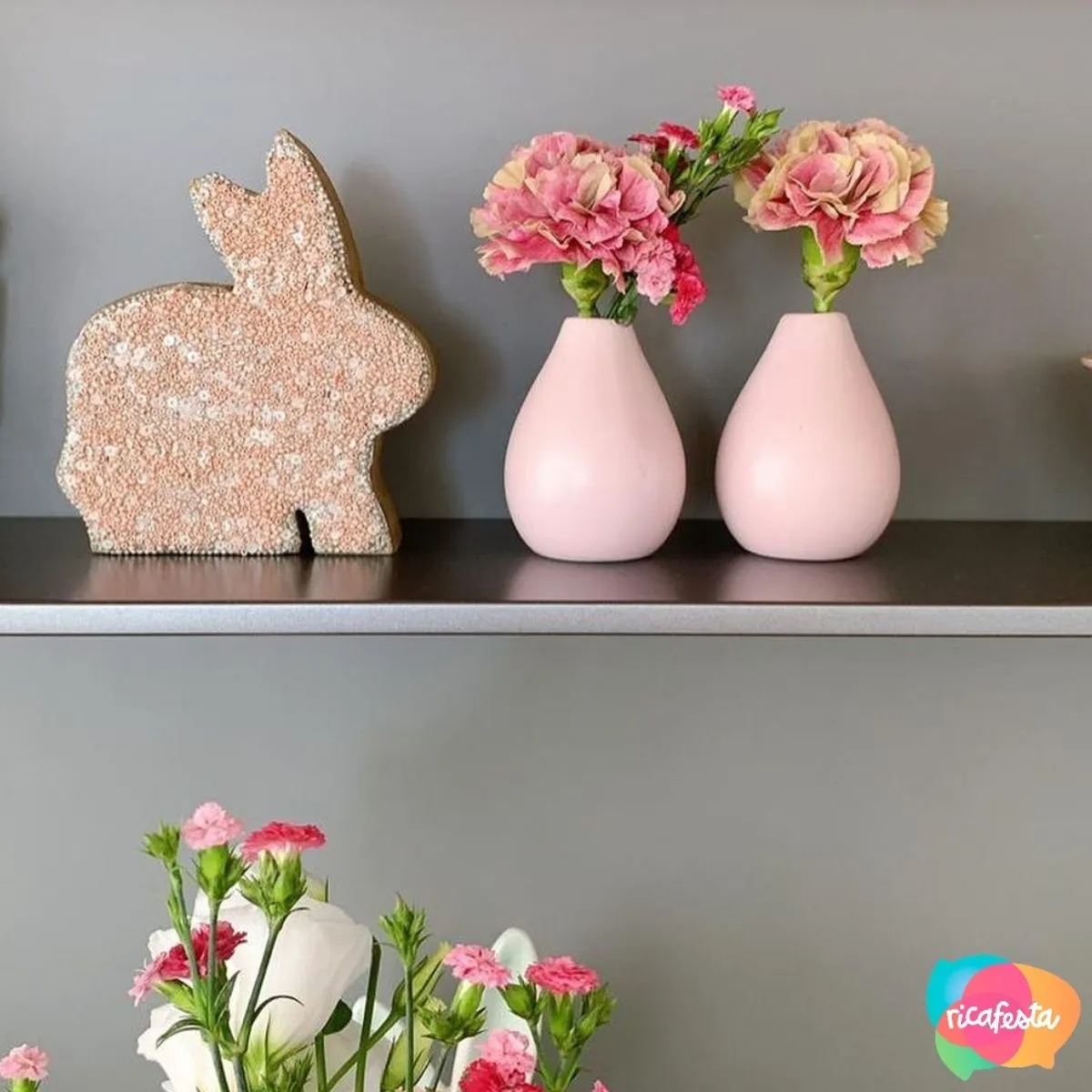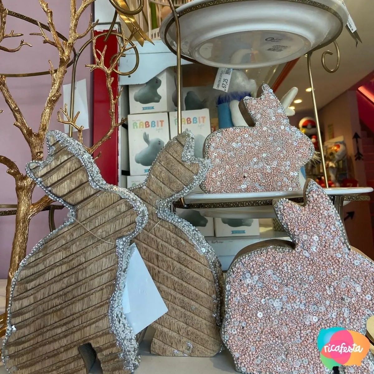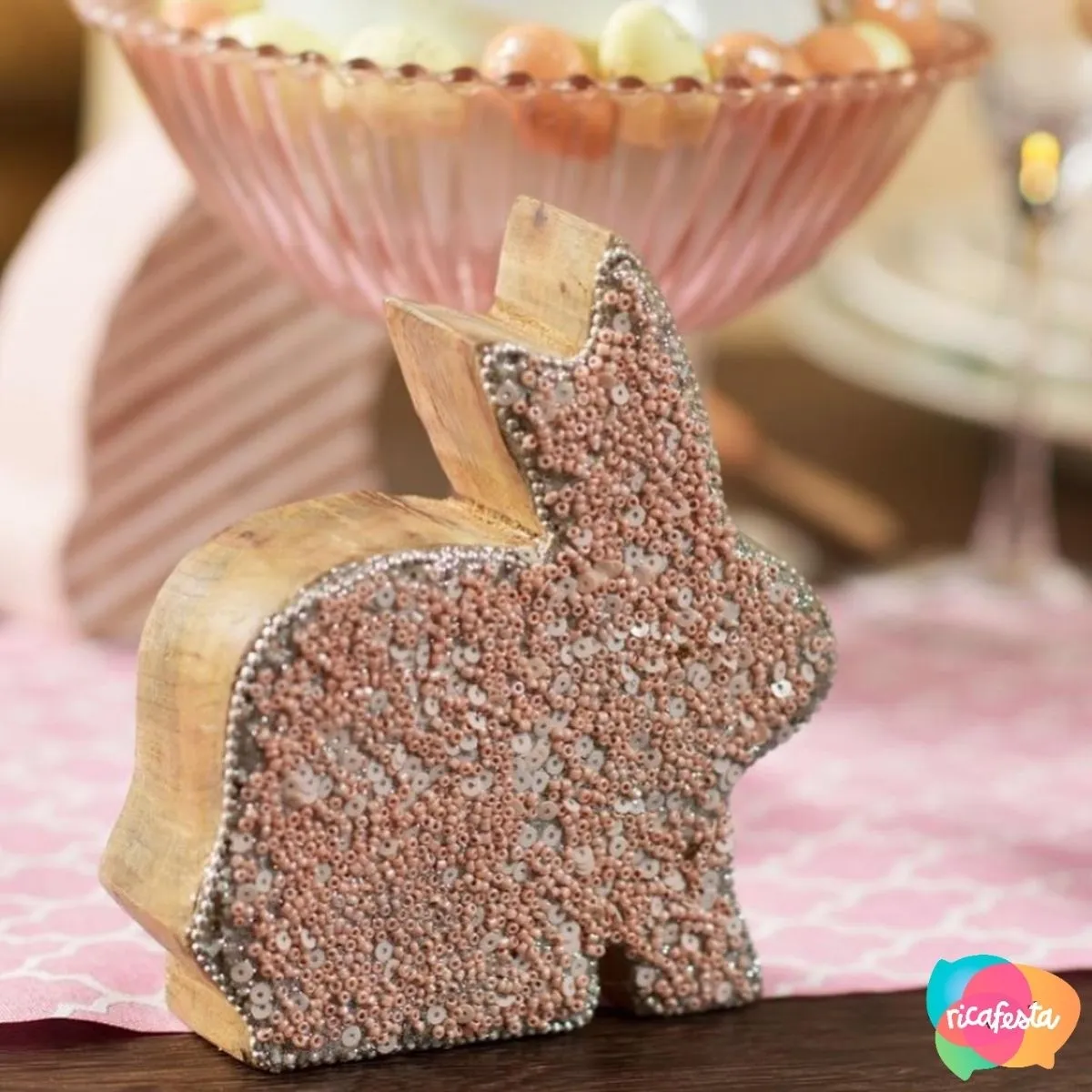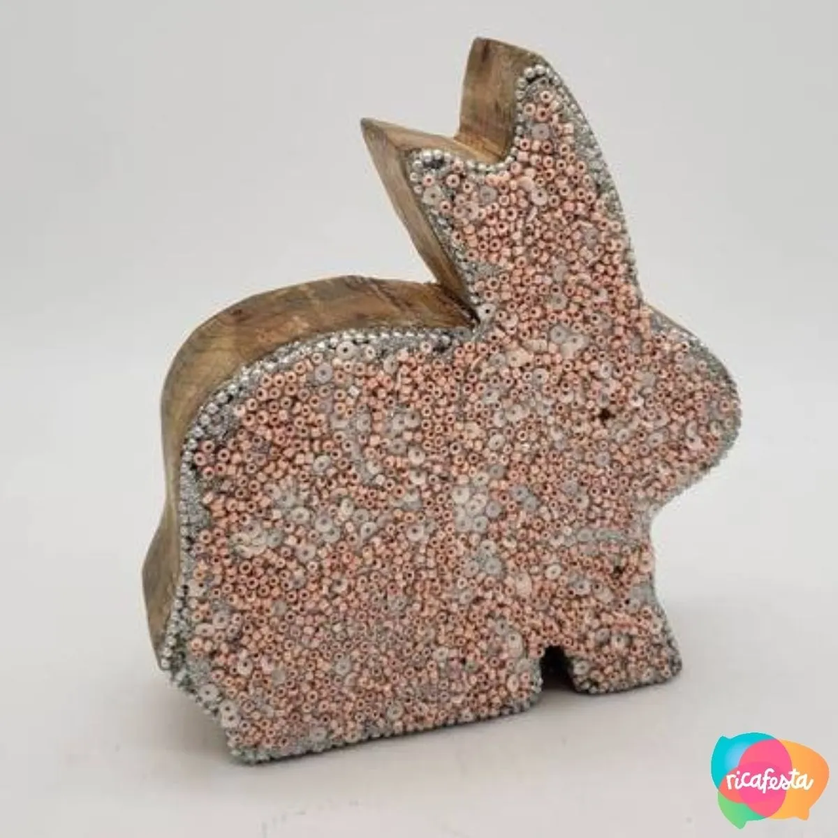 COELHO DE MADEIRA COM APLIQUE BRILHANTE CHICLE 15 x 13 x 4 cm