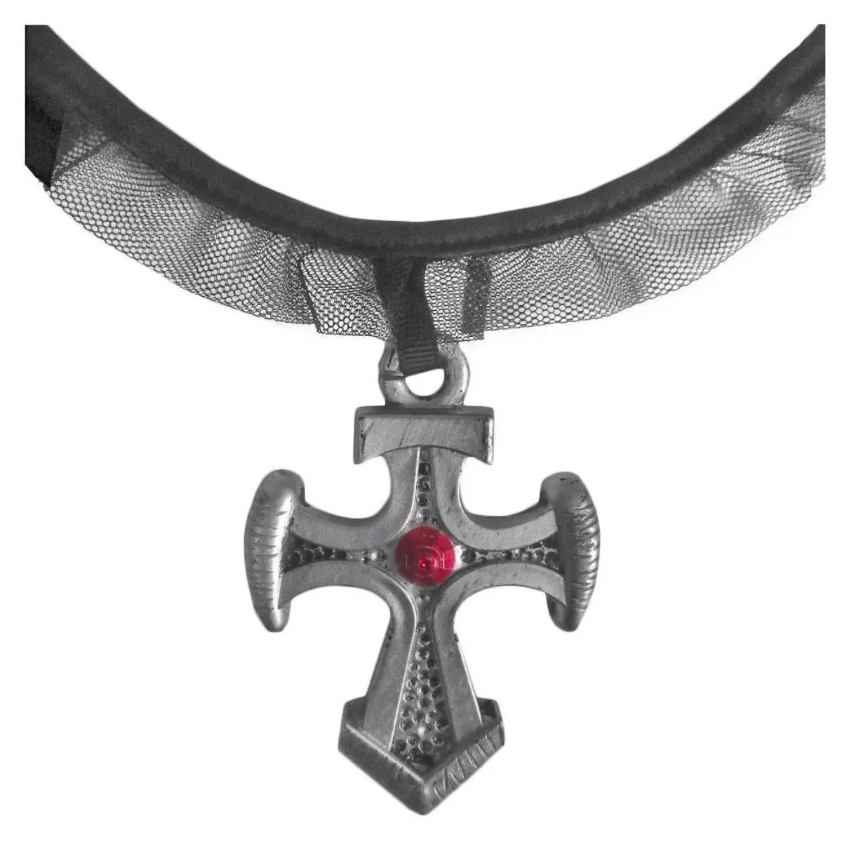Complete sua fantasia de vampiro(a) com este incrível colar gótico com cruz medieval, perfeito para eventos de Halloween, festas à fantasia e encenações teatrais. Com acabamento detalhado, fita de tecido e uma pedra vermelha no centro, esse acessório dá um toque sombrio e elegante ao visual!
