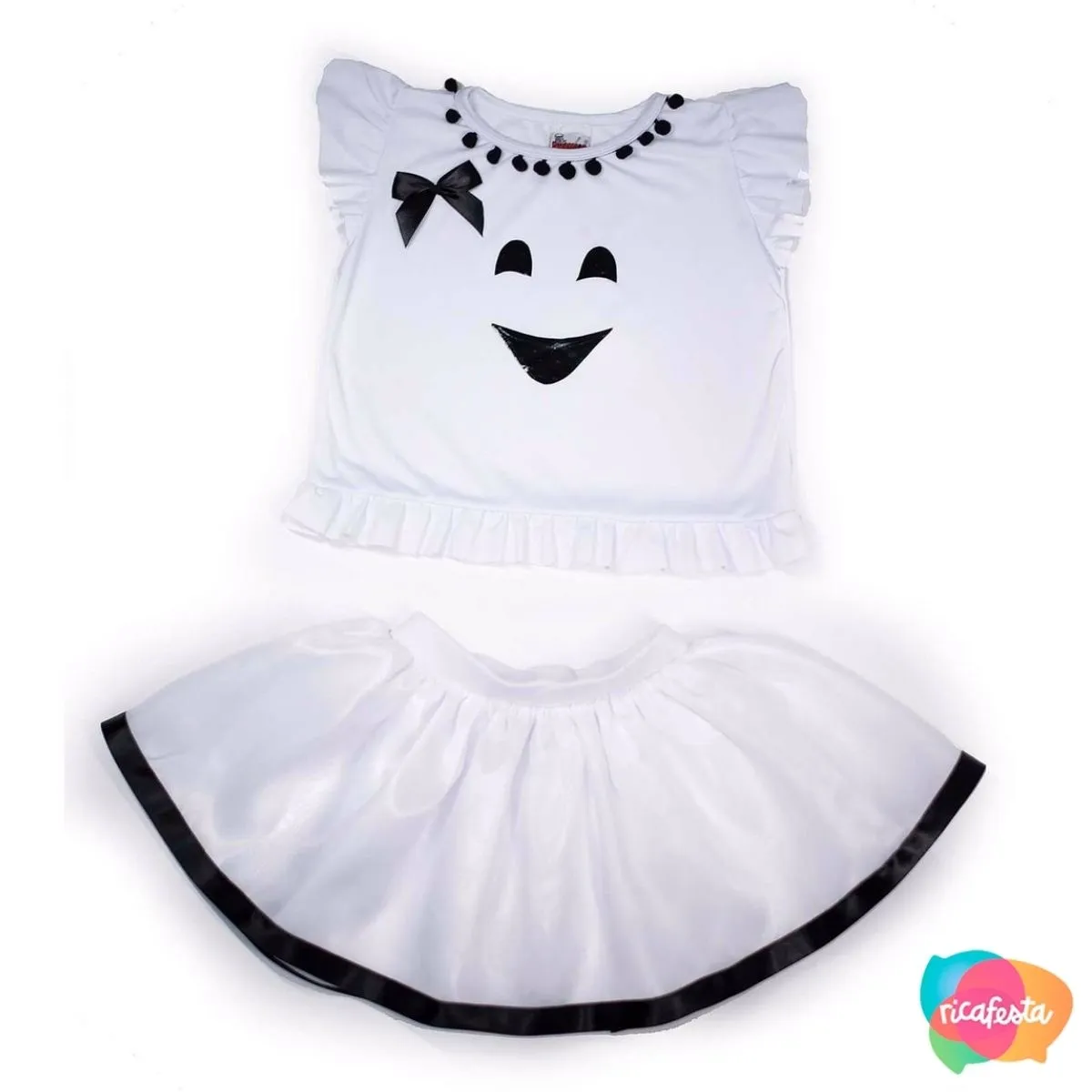 A blusinha tem estampa de fantasminha sorridente com aplicação de lacinhos e pompons, enquanto a saia rodada com tule e acabamento em fita preta completa o look com um toque encantador.
