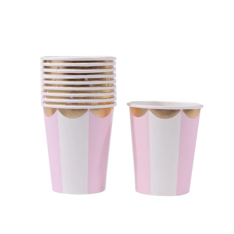Copo de Papel Listrado Branco e Rosé Antigo com Borda Ondulada Prateada – Kit com 10 Unidades