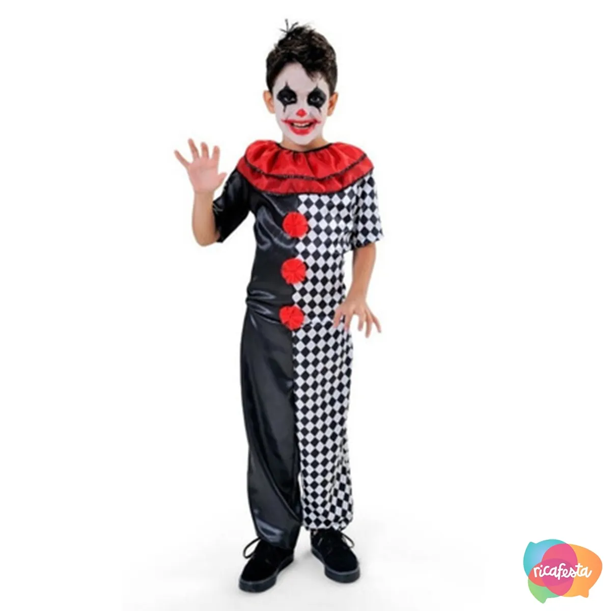 Confeccionada em 100% poliéster, a fantasia é leve, confortável e fácil de vestir. O macacão de manga curta combina o preto liso com estampa em losangos preto e branco, e detalhes em vermelho vibrante, como os pompons frontais e a gola bufante. Um look completo e cheio de personalidade para os pequenos que adoram se destacar.