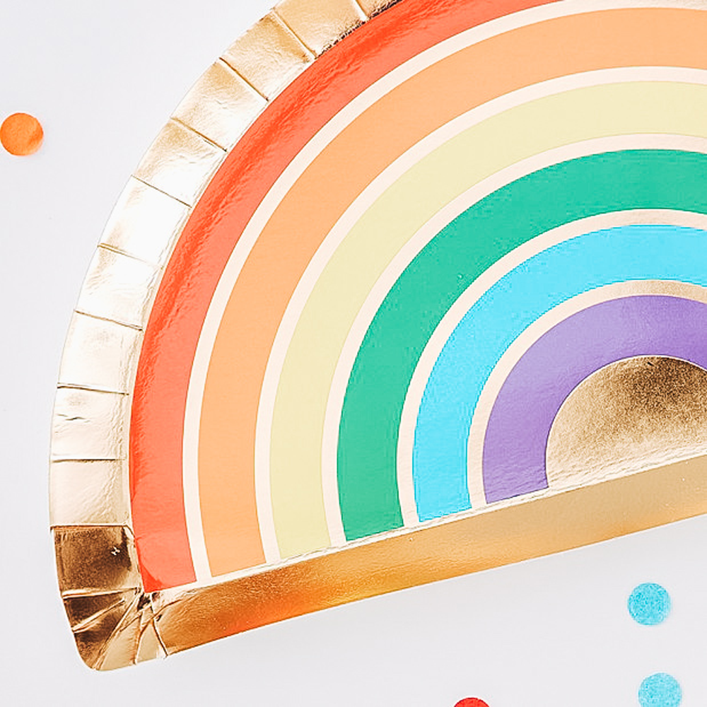 Leve cor, alegria e boas energias para a sua festa com esses pratos de papel recortados em formato de arco-íris. Feitos em papel cartonado resistente, são ideais para servir doces, petiscos ou decorar a mesa com muito estilo e personalidade.