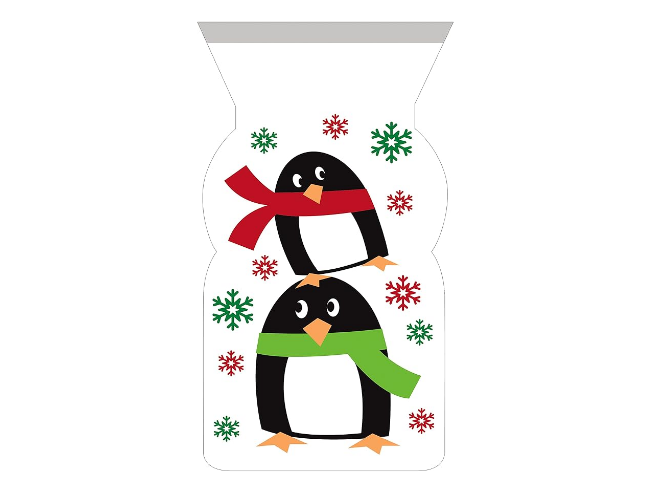 Fabricados em celofane transparente com detalhes coloridos, os saquinhos oferecem um visual alegre e divertido, perfeito para festas infantis, eventos de inverno, Natal ou qualquer ocasião que mereça um toque especial.